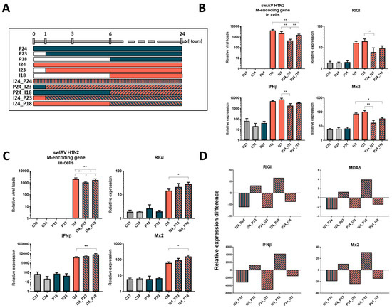 Protocol (A) and relative expression of viral and cellular transcripts (B,C) of the different conditions in newborn pig tracheal cells showing the impact of the delay and the order of the viruses on swIAV H1N2 replication and NPTr cells response. Difference of the relative expression between dual stimulations and influenza single infections is represented in panel (D). Cells were infected at a MOI of 3, n= 6 wells per condition for qPCR. C23 and C24 stand for the non-infected conditions over 23 h and 24 h respectively, P24 stands for PRRSV-1 stimulation over 24 h, I24 for swIAV H1N2 infection over 24 h, I24_P24, P24_I23, P24_I18 stand for dual administrations (PRRSV-1 then swIAV) of both viruses with a delay of 0, 1, and 6 h respectively. I24_P23 and I24_P18 stand for dual administration after reversing the viruses (swIAV then PRRSV-1) order with a delay of 1 and 6 h respectively. Mean values and standard deviations are represented. Comparisons were carried out using a one-way ANOVA test and Tukey’s post-test after sorting the data by rank. Differences were considered significant when p < 0.05 (*) or p < 0.01 (**).