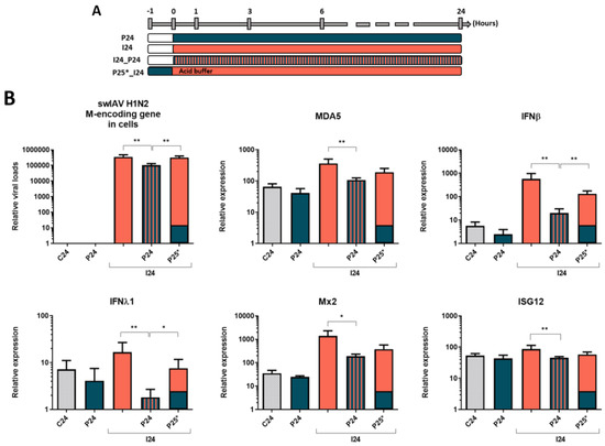 Protocol (A) and relative viral loads and relative expression of cellular transcripts (B) showing the impact of the inactivation of non-penetrated PRRSV-1 particles by the acid buffer wash on swIAV H1N2 replication and NPTr cells response. Cells were infected at an MOI of 3, n= 6 wells per condition for qPCR. C24 stands for the non-infected condition over 24 h, P24 stands for PRRSV-1 stimulation over 24 h, I24 for swIAV H1N2 infection over 24 h, I24_P24 for the coincubation of both viruses over 24 h, and P25*_I24 for the stimulation with PRRSV-1 for 1 h then infection with swIAV H1N2 for 24 h after an acid buffer wash. Mean values and standard deviations are represented. Comparisons were carried out using a one-way ANOVA test and Tukey’s post-test. Differences were considered significant when p < 0.05 (*) or p < 0.01 (**).