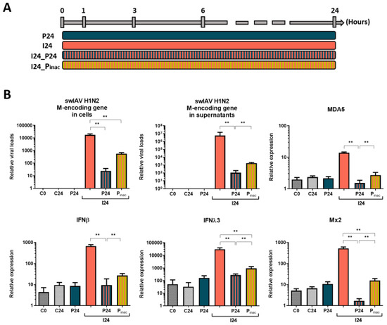 Protocol (A) and relative viral loads and relative expression of cellular transcripts (B) of the different conditions in newborn pig tracheal cells showing the impact of inactivated PRRSV-1 on swIAV replication and NPTr cells response compared to live PRRSV-1. Cells were infected at an MOI of 3, n= 6 wells per condition for qPCR. C0 and C24 stand for the non-infected conditions over 0 h and 24 h respectively, P24 stands for PRRSV-1 stimulation over 24 h, I24 for swIAV H1N2 infection over 24 h, I24_P24 and I24_Pinac for the coincubation of both viruses over 24 h using live and inactivated PRRSV-1, respectively. Mean values and standard deviations are represented. Comparisons were carried out using a one-way ANOVA test and Tukey’s post-test. Differences were considered significant when p < 0.05 (*) or p < 0.01 (**).