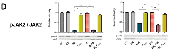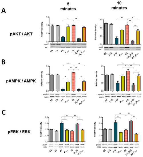 Western blots of phospho-AKT (A), phospho-AMPK (B), phospho-ERK1/2 (C), and phospho-JAK2 (D) in newborn pig tracheal cells infected with swIAV H1N2 in the absence or presence of PRRSV-1. Cells were infected at an MOI of 3 and harvested simultaneously at 5 and 10 min, so the results are representative of two independent experiments. C0, C5, and C10 stand for the cells from the non-infected conditions over 0, 5, and 10 min; P5, P10 and Pinac for cells stimulated with active or inactivated PRRSV-1 simultaneously for 5 and 10 min, while I5 and I10 stand for cells infected with swIAV H1N2 for 5 or 10 min. AKT, AMPK, ERK, and JAK2 are shown as loading controls and did not change with each condition over time. Mean values and standard deviations are represented, n= 3 wells per condition. Comparisons were carried out using a one-way ANOVA test and Tukey’s post-test after sorting the data by rank. Differences were considered significant when p < 0.05 (*) or p < 0.01 (**).