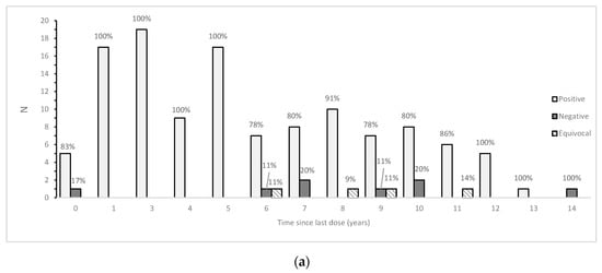 Figure 4a–c show the number of positive, negative and equivocal subjects in relation to the distance from the last dose of vaccine received. Figure 4a shows the overall scenario, in which measles seropositivity remains high up to eight years since the last dose in subjects who had received both the doses. In Figure 4b, we can observe that all those vaccinated with just the first dose are positive (100%) except one, who received the vaccination in the same year of recruitment. On the other hand, although subjects who received two/three doses present a slightly higher number of negative/equivocal subjects, the seroprevalence appears to be long-lasting up to 13 years since the last dose (Figure 4c). The negative and equivocal subjects are among those who received two/three doses, from 6 to 14 years before the serological test (Figure 4c).