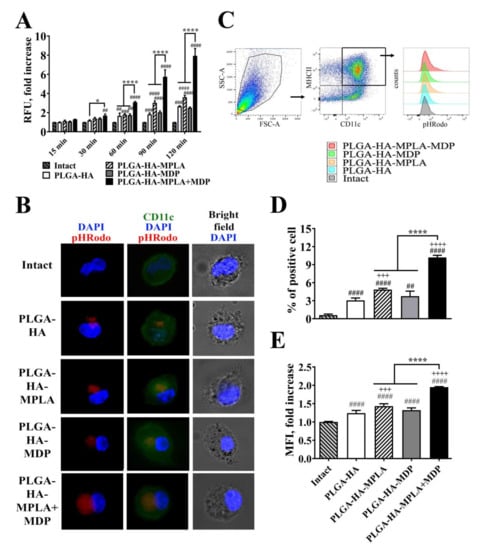 PLGA NPs containing both MPLA and MDP are more effectively phagocytosed by bone marrow-derived dendritic cells (BMDCs) compared to NPs containing individual PRR agonists. (A) A time course of phagocytosis quantification by BMDCs of PLGA NPs containing pHRodo-stained hemagglutinin (HA). Immature BMDCs isolated from naïve C57BL/6 mice were seeded in a 96-well plate at 2 × 105 cells per well in complete RPMI medium. The next day, PLGA-HA, PLGA-HA-MPLA, PLGA-HA-MDP, and PLGA-HA-MDP-MPLA formulations produced with pHRodo-labeled hemagglutinin were added in a 100 μg/mL final concentration. The medium was removed at the indicated time points, BMDCs were washed with PBS, and the integral fluorescence of each well was determined using a Biotek microplate reader. Each bar represents the mean fold increase ± SD (whiskers) in relative fluorescence units (RFU) over intact (untreated) cells. The mean value of untreated cells (= 1088 ± 10 RFU) was taken equal to 1 (100%). Experiment was performed in triplicate and repeated twice. (B) Representative fluorescence microscopy images of BMDCs treated with pHRodo-stained PLGA NPs for 120 min. BMDCs were stained with anti-CD11c antibodies (green). The cell nucleus was visualized with DAPI (blue). Phagocytosed PLGA NPs were specifically visualized by pHRodo (red) fluorescence. Scale bar represents 20 μm. (C) Representative gating strategy used to assess the phagocytic activity of BMDCs. BMDCs were initially gated in an forward versus side scatter (FSC vs. SSC) dot plot and then identified as double positive (MHCII+ CD11c+) population. Phagocytic activity of BMDCs was determined by (D) % of pHRodo-positive BMDCs as well as (E) fold increase in mean fluorescence intensity (MFI) of total MHCII+ CD11c+ cells relative to untreated cells 120 min after the addition of PLGA NPs. Mean value of untreated cells (= 749.5 ± 9.2 RFU) was taken equal to 1 (100%). Each bar represents the mean ± SD from three independent experiments, each performed in triplicate. Significant differences between PLGA NPs and intact cells are indicated by hashes: ## for p < 0.01, ### for p < 0.001, or #### for p < 0.0001. Significant differences between PLGA NPs with or without PRR agonists are indicated by plus signs: +++ for p < 0.001 or ++++ for p < 0.0001. Significant differences between PLGA-HA-MPLA+MDP and PLGA-HA-MPLA or PLGA-HA-MDP are indicated by asterisks and brackets: * for p < 0.05, or **** for p < 0.0001. P-values were calculated using two-way RM ANOVA post-hoc Dunnett’s test (A) and one-way ANOVA post-hoc Tukey’s test (D,E).