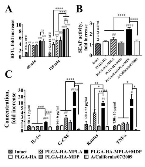 It is considered that live attenuated vaccines possess higher immunogenic properties compared to subunit vaccines. To evaluate whether adjuvantation with a combination of TLR4 and NOD2 agonists could elevate immunogenicity of subunit vaccines comparable to ones based on whole pathogens, we focused on the earliest events of host–pathogen interaction (phagocytosis, activation of proinflammatory transcription factors and cytokine expression) crucial for further adaptive immune response, but where other mechanisms specific for live attenuated vaccines (e.g., antigen propagation due to pathogen replication) are disregarded. We used a mouse adapted A/California/07/2009 (H1N1) virus as an example of LAIV. It should also be noted that while the size of the particles could affect the immunogenicity of particulate vaccines, the influenza virus could be an adequate counterpart for prepared PLGA NPs with similar dimensions, i.e., within 80–120 nm [26]. We determined the size distribution of the obtained samples of PLGA NPs and H1N1 influenza virus using the NTA method (Figure S5). Subunit and whole virus vaccines showed similar statistically indistinguishable sizes (161 ± 55 nm for PLGA-HA-MPLA + MDP and 91 ± 64 nm for influenza virus samples), which allow us to speculate that further effects will only be a result of differences in particle content. In the next step, in order to measure the quantity of entrapped particles into phagosomes, we stained viral particles with pHrodo dye and obtained virus sample with a stain index (mean fluorescence/number of particles) similar to that previously obtained for the PLGA NPs (2.6 × 10−9 for PLGA-HA-MPLA+MDP and 3.5 × 10−9 for influenza virus samples). Lastly, we normalized the numbers of particles in both samples using the NTA method (1010 particles per well for PLGA-HA-MPLA+MDP and influenza virus samples) before addition to RAW-Blue cells. At all measured time points (40 and 120 min), the addition of virus particles and PLGA-HA-MPLA+MDP showed significantly higher levels of specific fluorescent signals compared to PLGA NPs containing individual PRR agonists (Figure 3A). A similar (statistically not significant) maximal fluorescence was registered after the addition of PLGA NPs containing both MDP and MPLA molecules and influenza virus particles. It is also important to note that the addition of PLGA-HA-MPLA + MDP (2.4-fold increase over intact cells) resulted in higher NF-κB/AP-1-dependent SEAP reporter gene expression in RAW-Blue cells compared to an equal number of virus particles (1.3-fold increase) (Figure 3B). The evaluation of cytokine production levels showed that the addition of PLGA-HA-MPLA + MDP induced a maximal production of IL-1α (1.9-fold increases over intact cells), G-CSF (27-fold increase), RANTES (9.7-fold increase), and TNFα (15.9-fold increase) (Figure 3C), whereas cells treated with influenza virus particles responded with decreased levels of G-CSF and TNFα over intact cells, which is in line with previous data describing the prominent ability of the H1N1 strain to inhibit cytokine responses in human macrophages [27]. Along with the absence of the toxic effects of influenza virus on RAW-Blue cells, the obtained results show that a complex adjuvant is able to increase the phagocytosis of subunit vaccine particles equal to control particles made of whole pathogens with even greater effects on further cell response.