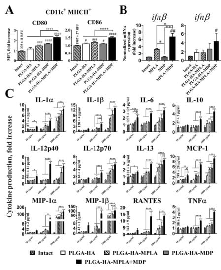 The expression levels of CD80 and CD86 were measured 18 h after the addition of PLGA NPs to immature BMDCs using flow cytometry analysis. The addition of PLGA NPs containing individual PRR agonists (PLGA-HA-MPLA and PLGA-HA-MDP) to BMDCs increased the levels of CD80 (1.5-and 1.7-fold increases over intact cells, respectively) and CD86 (1.2-and 1.1-fold increases, respectively) expression, compared to untreated cells (Figure 4A). Along with this, the maximal levels of CD80 (2.4-fold) and CD86 (1.5-fold) maturation markers were observed after the addition of PLGA NPs containing both PRR agonists (PLGA-HA-MPLA + MDP).