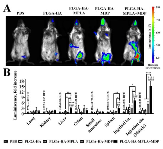 The obtained data show that PLGA-HA results in minimal NF-κB elevation at the site of injection compared to PBS-treated mice (Figure 5A). The inclusion of individual PRR agonists into PLGA NPs results in a significantly increased area and an NF-κB-dependent luminescence level at the site of injection compared to NPs without any PRR agonist. The injection of PLGA-HA-MPLA + MDP resulted in the highest luminescence level at the site of injection with distribution to the abdominal region. To identify organs and tissues involved in immune response after immunization with PLGA NPs containing a complex adjuvant, we measured luminescence in the protein lysates of thigh muscles (injection site) and of inguinal lymph nodes (closest to the injection site), lungs, kidneys, liver, colon, small intestine, and spleen. PLGA NPs without PRR agonists did not result in a significant increase in the NF-κB-dependent luminescence signal of any organ or tissue (Figure 5B). Interestingly, vaccination with PLGA-HA-MDP and PLGA-HA-MPLA resulted in different activation profiles. PLGA-HA-MDP significantly increased NF-κB-dependent luminescence at the site of injection (5.1-fold increase), whereas PLGA-HA-MPLA induced significantly higher levels in inguinal lymph nodes (3.7-fold increase) over PBS-treated mice. PLGA NPs containing both PRR agonists resulted in maximal levels of NF-κB activation at both sites of injection (15.2-fold increase over PBS-treated mice) and inguinal lymph nodes (7.3-fold increase) as well as in liver (3.0-fold increase) and spleen (3.0-fold increase), which were not affected after immunization with PLGA-HA-MDP and PLGA-HA-MPLA NPs.