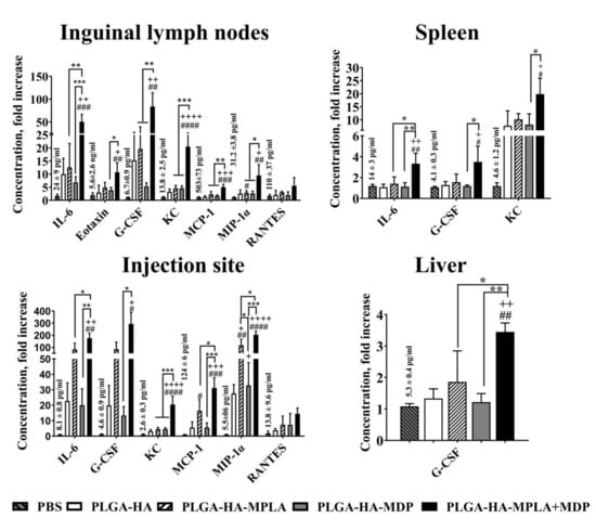 To characterize the early immune outcome of potentiated levels of NF-κB after immunization with prepared PLGA NPs, we measured the concentration of cytokines at the site of injection and in organs where potentiated NF-κB activity has been registered. For this purpose, BALB /c mice (5 per group) were immunized with PLGA NPs (1 mg/mouse). Twenty-four hours after injection, the concentrations of 23 cytokines were measured in thigh muscle as well as liver, spleen, and inguinal lymph node homogenates (Figure 6). The broadest cytokine expression profile was detected in inguinal lymph nodes. Here, PLGA-HA-MPLA + MDP induced the expression of 7 out of 23 cytokines: IL-6 (50.4-fold), eotaxin (10.7-fold), G-CSF (83.8-fold), KC (20.5-fold), MCP-1 (5.0-fold), MIP-1α (9.5-fold), and RANTES (5.5-fold) over PBS-treated mice. Vaccination with PLGA-HA-MDP induced the production of 3 of the 23 measured cytokines: IL-6 (6.8-fold), G-CSF (5.2-fold), and KC (4.6-fold), whereas only KC (4.5-fold) and MIP-1α (2.9-fold) were elevated after PLGA-HA-MPLA immunization. At the injection site, the number of cytokines with elevated levels was slightly lower than in the lymph nodes (6 out of 23) after the injection of PLGA-HA-MPLA + MDP: IL-6 (174.4-fold), G-CSF (293.1-fold), KC (20.5-fold), MCP-1 (31,1-fold), MIP-1α (204.0-fold), and RANTES (14.5-fold). The injection of PLGA-HA-MPLA resulted in elevated levels of KC (4.5-fold) and MIP-1α (2.9-fold). PLGA-HA-MDP induced increased expression of IL-6 (6.8-fold), G-CSF (5.2-fold), and KC (4.6-fold) compared to PBS treated mice. A much weaker response was observed in the spleen. The production of 3 out of 23 cytokines was significantly elevated after the injection of PLGA-HA-MPLA + MDP: IL-6 (3.3-fold), G-CSF (3.5-fold), and KC (19.9-fold). Only KC levels were elevated in the spleen after PLGA-HA-MPLA (10.2-fold) or PLGA-HA-MDP (7.8-fold) immunization. The dimmest effect on cytokine production was observed in the liver. Only G-CSF was significantly elevated after the immunization with PLGA NPs containing both PRR agonists: 3.5-fold increase over the PBS-treated group.