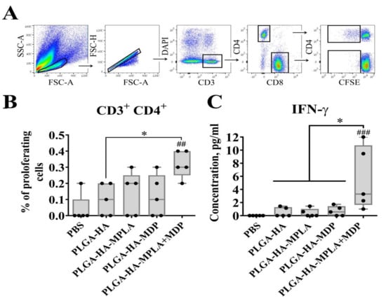 To test this in terms of cell-mediated immune response, we immunized mice with prepared PLGA NPs (three intramuscular injections were given with two week intervals, 5 mice/group), and splenocytes were then isolated for analysis two weeks after the last immunization. CD4+ and CD8+ T-cell responses were detected by a CFSE fluorescence proliferation assay (Figure 7A,B) and IFNγ production 72 h after hemagglutinin restimulation in vitro (Figure 7C). The obtained data show that HA-stimulated T-cell expansion in all experimental groups was limited to CD4+ proliferating T-cells. (The insignificant differences in the percentage of CFSEdim CD8+ T cells are not shown). The encapsulation of individual TLR4 and NOD2 agonists in vaccine PLGA NPs did not result in a significant increase in proliferating CD4 T-cells (0.14% and 0.12%, respectively) compared to a group immunized with PLGA-HA NPs without immunostimulatory molecules (0.10%). The only statistically significant difference was seen in the mice immunized with PLGA-HA-MPLA + MDP (0.32% CD4+ T-cells) compared to PBS- and PLGA-HA-treated mice.
