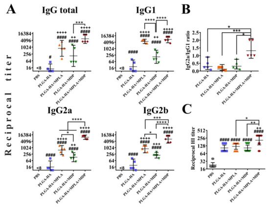 According to the obtained data, the addition of individual PRR agonists (PLGA-HA-MPLA or PLGA-HA-MDP) to the vaccine formulation resulted in a significantly higher production of total HA-specific IgG antibodies compared to PLGA-HA NPs without any PRR agonists (reciprocal geometric mean titer (GMT) of 800, 174, and 13, respectively) (Figure 8A). However, the most prominent IgG response was observed in mice immunized with PLGA particles containing both PRR agonists (5571). Further IgG subclass response analysis revealed the maximal production of all three measured IgG subclasses in the PLGA-HA-MPLA + MDP-vaccinated group. Adjuvantation with a complex adjuvant results in a significant elevation of IgG1 (7351), IgG2a (9700), and IgG2b (6400) titers compared to vaccine formulations adjuvanted with individual MPLA (4850, 606, and 800, respectively) or MDP (174, 132, and 200, respectively) (Figure 8B). It is worth noting that the difference in IgG1 titers between PLGA-HA-MPLA + MDP (7351) and PLGA-HA-MDP (174) was significant, but not between PLGA-HA-MPLA + MDP (7351) and PLGA-HA-MPLA (4850). As a result, only PLGA NPs containing both PRR agonists showed a ratio of IgG2a/IgG1 antibodies >1 (1.4) compared to control NPs containing individual MDP or MPLA molecules (0.1 and 0.3, respectively) (Figure 8B). Consistent with IgG titers, PLGA-HA-MPLA + MDP NPs induced significantly higher HI responses (reciprocal GMT: 211) compared to the PLGA-HA (106), PLGA-HA-MDP (106), and PLGA-HA-MPLA (121) NPs (Figure 8C).