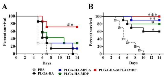 PLGA NPs containing both MPLA and MDP led to a stronger protection in mice than NPs containing individual PRR agonists. Kaplan–Meier survival curves of mice i.m. immunized three times with (A) 1 dose (1 mg/mouse, n = 8 per group) or (B) 2 doses (2 mg/mouse, n = 10 per group) of PLGA NPs: PLGA-HA, PLGA-HA-MPLA, PLGA-HA-MDP, and PLGA-HA-MDP-MPLA. Non-immunized control mice received PBS. Two weeks after last immunization, mice were infected using a lethal dose (50LD50) of the A/California/07/2009 (H1N1) strain virus. Mortality was monitored daily for 14 days post-challenge. # indicates a significant difference (p < 0.05) between PLGA-HA-MPLA+MDP and PLGA-HA vaccinated animals. Significant differences between vaccinated with PLGA NPs and non-vaccinated animals are indicated by asterisks: * for p < 0.05 and ** for p < 0.01 and *** for p < 0.001 (log-rank test).