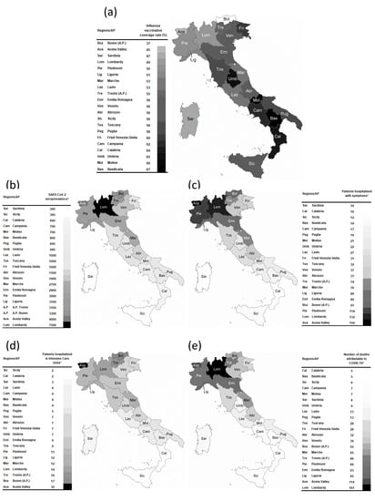 Data on influenza vaccination coverage rate (panel a), SARS-CoV-2 seroprevalence (panel b), and occurrence of COVID-19 clinical outcomes (per 100,000 inhabitants) in each region and AP (panels c, d, and e) are shown in Figure 1 and Table S1. Influenza vaccination coverage rates were highly variable among the regions and AP, ranging from 37% in the autonomous province of Bozen to 67% in Basilicata.