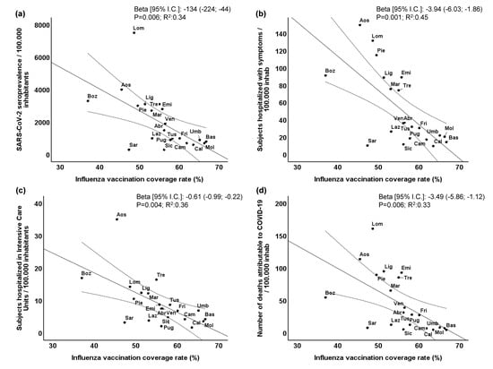 Inverse and significant univariate correlations along the different regions and AP between the influenza vaccination coverage rate and the SARS-CoV-2 seroprevalence (panel a), patients hospitalized with symptoms (panel b), patients hospitalized in intensive care units (panel c), and number of deaths attributable to COVID-19 (panel d) were found (Figure 2). All the dependent variables were normalized per 100,000 inhabitants. The Beta correlation coefficient ranged from −134 to −0.61 (all p ≤ 0.01). The R2 values ranged from 0.33 for number of deaths attributable to COVID-19 to 0.45 for patients hospitalized with symptoms.