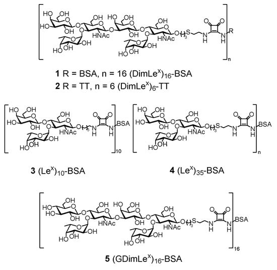 - Nejatie, A.; Jegatheeswaran, S.; Auzanneau, F.I. Synthesis of LacNAcLex- and DimLex-BSA Conjugates and Binding to Anti-Polymeric Lex mAbs. Eur. J. Org. Chem. 2019, 2019, 6631–6645. [Google Scholar] [CrossRef]