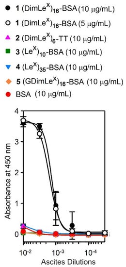 The ascites of SH2 were titrated against five glycoconjugates shown in Figure 1: (DimLex)16-BSA 1, (DimLex)6-TT 2, (Lex)10-BSA 3, (Lex)35-BSA 4, and (GDimLex)16-BSA 5 as well as BSA.