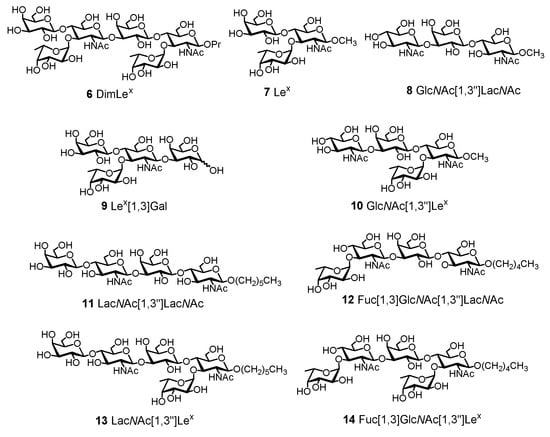 We have previously reported the chemical synthesis of the DimLex propyl hexasaccharide 6 as well as that of the Lex methyl glycoside 7 [38,43]. In addition, we have also described the synthesis of tri-, tetra-, and pentasaccharide fragments of DimLex 8, 10–14 [44,45,46,47] shown in Figure 3. Tetrasaccharide fragment 9 (Lex[1,3]Gal, Figure 3) was a generous gift of Samain and co. [48].