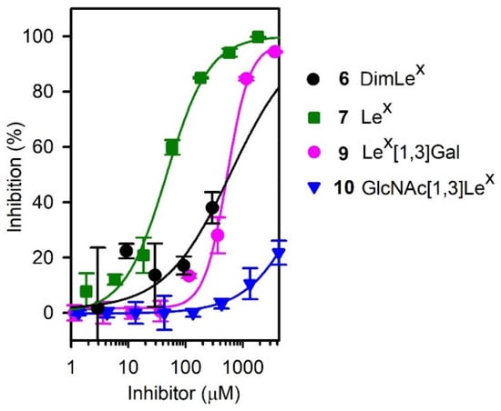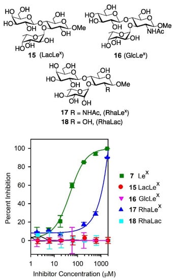 Given the surprising ability of the Lex trisaccharide 7 to inhibit the binding of SH2 to (DimLex)16-BSA 1, we also investigated the inhibition of this binding by our previously reported [43,49] Lex analogues 15–18 (Figure 6). While D-GlcNAc and D-Gal are replaced by a D-glucose unit in analogue 15 (LacLex) and 16 (GlcLex), respectively, the L-fucose residue is replaced by an L-rhamnose unit in analogue 17 (RhaLex). In analogue 18, both the D-GlcNAc and L-Fuc are replaced by D-glucose and L-rhamnose units, respectively. Our previous studies [36] have shown that such analogues maintain the typical stacked conformation of the Lex trisaccharide [36,50,51,52,53,54]. We performed competitive inhibitions experiments using the (DimLex)16-BSA conjugate 1 (5 μg/mL) as the immobilized ligand and analogues 15–18 as soluble competitors. Figure 6 shows the corresponding inhibition curves, while Table 2, entries 2–5, gives the IC50 for each analogue and the corresponding changes in free energy of binding Δ(ΔG) taking Lex 7 as the reference inhibitor (entry 1).