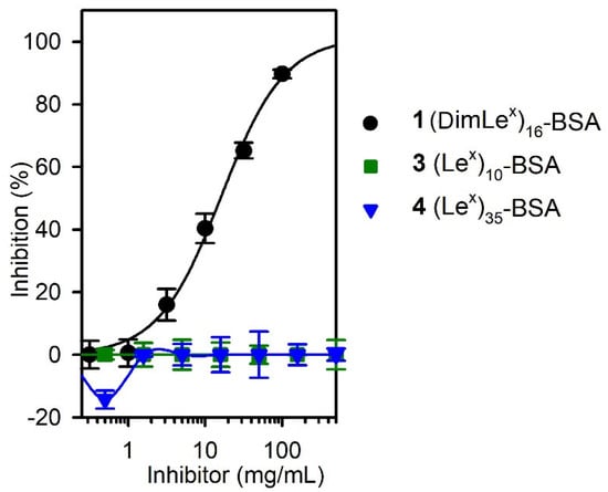 To further confirm the results of our titration experiments, we carried out competitive inhibition experiments using the (DimLex)16-BSA 1 as the immobilized antigen and the conjugates (DimLex)16-BSA (1), (Lex)10-BSA (3), and (Lex)35-BSA (4) as soluble inhibitors. Indeed, as expected, only the DimLex conjugate 1 was able to inhibit binding, while the Lex conjugates did not (Figure 5).
