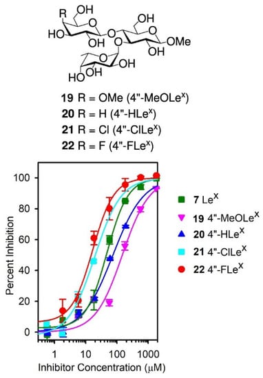 Given the lack of inhibition observed for GlcLex 16 and the lack of binding of the (GDimLex)16-BSA conjugate in our titration experiments (Figure 2), we investigated the importance of the galactosyl 4-OH group for recognition by SH2 using the previously described [57] analogues 19–22 in competitive binding experiments. In these analogues, the galactosyl 4-OH is either methylated (4″-MeOLex, 19), deoxygenated (4″-HLex, 20), or replaced by a halogen in the 4″-ClLex (21) and 4″-FLex (22) (Figure 7).