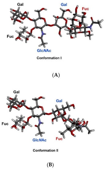 Known [66] conformations of the DimLex hexasaccharide in fast exchange: (A) Conformation I; (B) Conformation II.