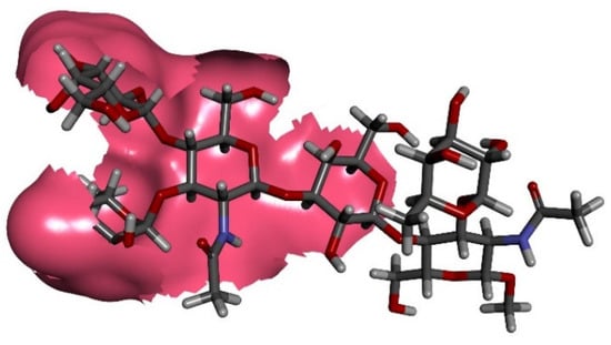 Our results should be compared to the work of Van Roon et al. who studied anti-Lex antibodies generated in mice infected with Schistosoma mansoni cercariae [28,29,72]. In their study, Van Roon et al. cloned mAb 291-2G3A (IgG3), which, similarly to SH2 and 1G5F6, was shown by surface plasmon resonance (SPR) studies to recognize a DimLex-HSA conjugate with greater affinity than Lacto-N-fucopentaose-HSA (LNFPIII-HSA) conjugate [29,72]. To understand the specificity of the antibody for Lex, Van Roon et al. performed X-ray crystallographic analysis of the Fab fragment of mAb 291-2G3-A in complex with the Lex trisaccharide. The binding site of mAb 291-2G3-A is described as a shallow pocket that, much like SH2 and 1G5F6, makes contact with all three sugar units of the Lex trisaccharide. Again, similarly to SH2 and 1G5F6, the 4-OH of galactose does not participate in an H-bond with the mAb 291-2G3-A binding site, but a tryptophan (W33) residue forms favorable aromatic stacking interactions with the hydrophobic patch of the galactosyl α face [29]. Finally, the authors also report an H-bond between the glucosamine acetamido nitrogen and an asparagine residue (Asn L91) in the binding site. Unfortunately, the authors were not able to obtain a crystal structure with DimLex and thus could not conclude if binding to 291-2G3-A to DimLex would extend further from the reducing end GlcNAc residue.