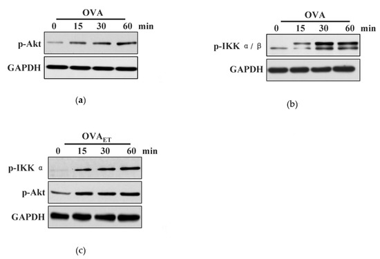 Endotoxin-containing pathogen and endotoxin-free antigen induce different effects on the phosphorylation of protein kinase B (Akt) and I-kappa B Kinase α (IKKα) in bone marrow precursor cells. (a–c) Murine granulocyte-macrophage colony-stimulating factor (GM-CSF) and interleukin-4 (IL-4) treated bone marrow precursor cells (BMPC) was incubated with endotoxin-containing pathogen ovalbumin (a,b) or endotoxin-free ovalbumin (c) (50 μg/mL) for indicated periods. The effects of endotoxin-containing pathogen and endotoxin-free ovalbumin on the phosphorylation of Akt and IKKα/β were determined by western blot analyses. GAPDH was used as an internal control. One representative from 3 independent experiments is shown. OVA: endotoxin-containing pathogen ovalbumin; OVAET: endotoxin-free ovalbumin.