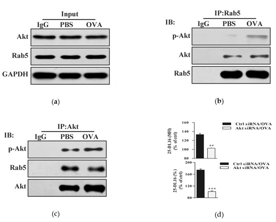 Akt phosphorylation is essential for endotoxin-containing pathogen-derived cross-presentation in bone marrow precursor cells. (a–c) Murine BMPC was incubated with endotoxin-containing pathogen ovalbumin (50 μg/mL). Akt expression (a) and interaction of phosphorylated Akt-Rab5 (b,c) were determined by co-immunoprecipitation (Co-IP) with Rab5 (b) or Akt (c) antibody. Isotype IgG was used as negative control. Whole cellular protein was used as input control. (d) Akt deficient and control BMPC was incubated with endotoxin-containing pathogen ovalbumin (50 μg/mL) and cross-presented OVA was assessed by flow cytometric analyses. Data are presented as the mean ± SEM, ** p < 0.01, *** p < 0.001, Student t-test. One representative from three independent experiments is shown. OVA: endotoxin-containing pathogen ovalbumin.