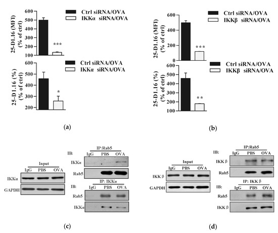 Both IKKα and IKKβ phosphorylation augment endotoxin-containing pathogen-derived cross-presentation in bone marrow precursor cells. (a,b) Murine IKKα/IKKβ deficient or control BMPC was incubated with endotoxin-containing pathogen ovalbumin (50 μg/mL) and cross-presented OVA was assessed by flow cytometric analyses. (c,d) Murine BMPC was incubated with endotoxin-containing pathogen ovalbumin (50 μg/mL) and the interaction of IKKα-Rab5 (c) or IKKβ-Rab5 (d) was investigated by Co-IP with Rab5, IKKα or IKKβ antibody, respectively. Isotype IgG was used as negative control. Whole cellular protein was used as input control. Data are presented as the mean ± SEM, * p < 0.05, ** p < 0.01, *** p < 0.001, Student t-test. One representative from three independent experiments is shown. OVA: endotoxin-containing pathogen ovalbumin.