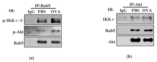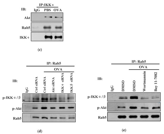 Reagents used in this study were from the following companies: Sigma-Aldrich (St. Louis, MO, USA) for dimethyl sulfoxide (DMSO) and endotoxin from Escherichia coli. Hyglos GmbH (Regensburg, Germany) for endotoxin-free EndoGrade-ovalbumin. PeproTech (Rocky Hill, NJ, USA) for murine granulocyte-macrophage colony-stimulating factor (GM-CSF) and interleukin-4 (IL-4). Cayman Chemical (Ann Arbor, MI, USA) for Bay11-7082, wortmannin. Phycoerythrin (PE)-conjugated 25-D1.16, (#141604) was from BioLegend (San Diego, CA, USA). Cell Signaling Technology (Beverly, MA, USA) for antibodies to IKKα (D3W6N, #61294; #2682), IKKβ (D30C6, #8943; L570, #2678), Akt (11E7, #4685; 40D4, #2920), phosphorylated Akt (Ser473) (#9271), phosphorylated IKKα/β (Ser176/180) (16A6, #2697), horseradish peroxidase (HRP) conjugate secondary antibody (#7074). Abcam (Cambridge, UK) for Rab5 (#ab218624, #ab18211). Santa Cruz Biotechnology (Dallas, TX, USA) for siRNAs of Akt (sc-43610), IKKα (sc-29366), IKKβ (sc-35645), and control siRNA (sc-37007), antibodies of Rab5 (D-11, sc-46692), Sec61α (G-20, sc-12322), glyceraldehyde-3-phosphate dehydrogenase (GAPDH) (6C5, sc-32233), and Protein A/G Plus-Agarose, Transfect reagent. HyClone (Logan, UT, USA) for BMPC medium and fetal bovine serum (FBS).