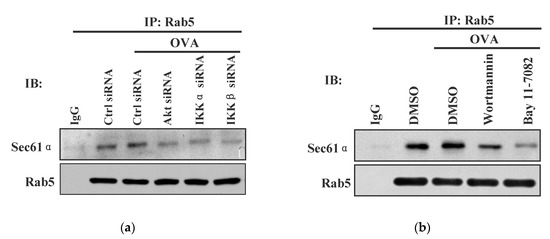 In the process of DC cross-presentation, p97 and TAP relocate to the endosome to transport the internalized antigen [4,17,18]. Sec61, another protein in the ER, relocate toward antigen-containing endosome and provide the energy for the event of transmembrane movement [18,19]. To investigate the potential role of Akt+ IKKα/β+ Rab5+ signalosome in endotoxin-containing pathogen-derived the endosomal relocation of Sec61, Akt/IKKα/β deficient or wortmannin/Bay11-7082 pretreated BMPC was incubated with endotoxin-containing pathogen and the interaction of Sec61α with Rab5 was re-assessed by Co-IP analyses. Whereas the loading of endotoxin-containing pathogen-increased the interaction of Sec61α-Rab5, the interaction of Sec61α with Rab5 was efficiently inhibited by the deficiencies of Akt, IKKα, and IKKβ (Figure 5a). Moreover, the interaction of Sec61α with Rab5 was also abrogated by the pretreatments with wortmannin and Bay11-7082 (Figure 5b). Endotoxin-containing pathogen-increased the interaction of Sec61β with Rab5 was also abrogated by the pretreatments with wortmannin and Bay11-7082 (Figure S5). The observation by immuno-fluorescent microscope revealed that the co-localized spots of Sec61β with Rab5 were exactly attenuated by the deficiencies of Akt, IKKα, and IKKβ (Figure S6). All these findings indicate that Akt+ IKKα/β+ Rab5+ signalosome play important roles in endotoxin-containing pathogen-derived the endosomal relocation of Sec61 in BMPC.