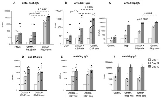 GMMA as a carrier for protein antigens: antigen-specific IgG response. Eight CD1 mice per group were s.c. immunized at days 0 and 28, with S. Typhimurium GMMA conjugates of Pfs25 (0.1 µg Pfs25/dose), CSP (0.1 µg CSP/dose) or fHbp (0.75 µg fHbp/dose). Protein antigens, GMMA alone or their physical mixtures were used as controls. Formulations were tested with Alhydrogel. Sera were collected at days 1, 27 and 42 and analyzed for anti-protein antigen-specific IgG response (A–C) and anti-OAg IgG response (D,E). Summary graphs of anti-antigen-specific IgG geometric mean units (bars) and individual antibody levels (dots) are reported. In graphs (D–F), no significant differences in ELISA units were observed. Datasets were analyzed using a two-tailed nonparametric Mann–Whitney test. p-values (rounded to the nearest larger number) less than 0.05 were considered statistically significant.