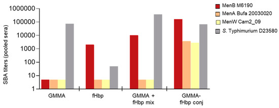 Subsequently, we immunized mice with MenB fHbp chemically conjugated to S. Typhimurium GMMA or with the corresponding physical mixture of fHbp and GMMA at the same doses or GMMA and fHbp alone. There is a clinical rationale in developing a vaccine that targets both nontyphoidal Salmonella and Neisseria meningitidis, both prevalent in Sub-Saharan Africa [38,39,40]. This Neisseria meningitidis antigen allowed us to measure not only the antigen-specific IgG production, but, also the functionality of the antigen-specific antibody response. For Neisseria meningitis, SBA is considered a correlate of protection in humans and consequently, it is an optimal functional assay to generate a proof of concept of the effectiveness of the humoral immune response in mice [41,42].