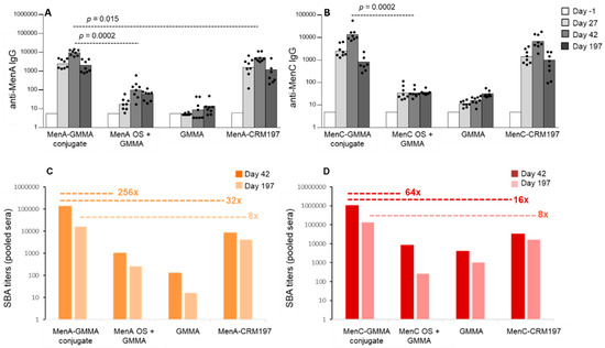 GMMA as a carrier for polysaccharides compared to traditional CRM197 conjugates. Eight CD1 mice per group were i.m. immunized at days 0 and 28, with MenA-GMMA (MenB) (A,C) or MenC-GMMA (MenB) conjugates (B,D) and their corresponding CRM197 conjugates at 1 µg Men oligosaccharide per dose, in the presence of Alhydrogel. MenB GMMA alone and their physical mixture with Men oligosaccharides were used as controls. Sera were collected at days 1, 27, 42 and 197 and analyzed for anti-PS-specific IgG response (A,B). Summary graphs of anti-PS IgG geometric mean units (bars) and individual antibody levels (dots) are reported. Anti-PS IgG were analyzed using a two-tailed nonparametric Mann–Whitney test. p-values (rounded to the nearest larger number) less than 0.05 were considered statistically significant. SBA titers of pooled sera collected 2 weeks and 6 months after second injection against MenA (C) or MenC (D) strains are reported.