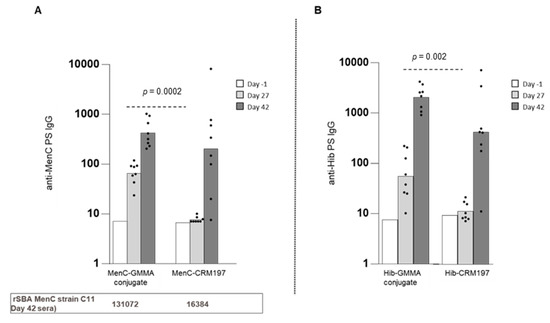 GMMA as a carrier for polysaccharides, formulations tested in the absence of Alhydrogel. Eight CD1 mice per group were s.c. immunized at days 0 and 28, with MenC-GMMA (MenB) or MenC-CRM197 conjugates ((A): 1 µg MenC oligosaccharide per dose). 8 adult rats per group were i.m. immunized at days 0 and 28, with Hib-GMMA (MenB) or Hib-CRM197 conjugates ((B): 0.5 µg Hib oligosaccharide per dose). Sera were collected at days 1, 27 and 42 and analyzed for anti-PS-specific IgG response. Summary graphs of anti-PS IgG geometric mean units (bars) and individual antibody levels (dots) are reported. SBA titers of pooled sera collected at day 42 from each group against MenC strain are reported in the table in panel A. Datasets were analyzed using a two-tailed nonparametric Mann–Whitney test. p-values (rounded to the nearest larger number) less than 0.05 were considered statistically significant.