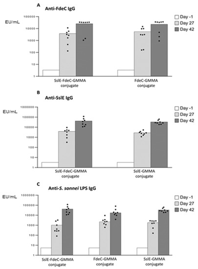 Through chemical conjugation, we can also display multiple antigens on the same GMMA particle. We verified this by linking two different E. coli antigens, SslE [43,44] and FdeC [45], on the same S. sonnei GMMA particle [4], with the potential to protect against two major diarrheagenic pathogens, Enterotoxigenic E. coli (ETEC) and Shigella [46]. The conjugate presenting SslE and FdeC on the same GMMA particle (Table S1) induced anti-E. coli antigen-specific IgG response and anti-S. sonnei LPS IgG response, not significantly different from the anti-antigen-specific IgG response induced by corresponding monovalent conjugates (Figure 5).