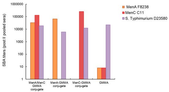 We also linked similar amounts of MenA and MenC oligosaccharides (Table S1) on S. Typhimurium GMMA. Also, in this case, no immune interference was detected by linking the two different saccharides on the same GMMA: the resulting conjugate elicited antibodies with strong bactericidal titers against MenA and MenC strains, similar to that induced by immunization with the monovalent MenA or MenC-GMMA conjugates (Figure 6). Again, the functionality of antibody response to S. Typhimurium was not negatively affected (Figure 6).