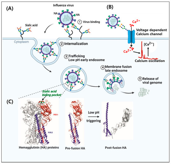Influenza A virus endocytosis and hemagglutinin proteins (HA) conformational change. (A) Process of the entry of influenza virus into host cell. The virus binds to sialic acid-containing proteins on the cell surface receptors by association with the viral hemagglutinin proteins (HA1, HA2). HAs also bind to the sialic acid-containing Ca2+ channel to trigger intracellular Ca2+ oscillations. The virus is then internalized by endocytosis. Acidification of the endosome causes a conformational change in the HA proteins that leads to a fusion between the viral membrane and the endosomal membrane. This allows the escape of the viral RNA and proteins into the cytoplasm. (B) Structure of the HA of IAV. The trimeric complex of HA is shown with one monomer highlighted in color (HA1; red, HA2; blue, and the receptor binding pocket; green). (C) The pre- and post-fusion conformations of HA [4]. This figure was created using BioRender (Toronto, ON, Canada).