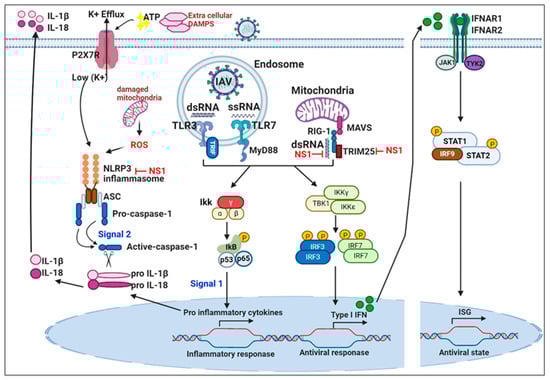 The intracellular cytoplasmic pattern-recognition receptor RIG-I is essential for the control of RNA virus infection. Upon IAV recognition, RIG-I recruits the adaptor MAVS protein to activate the IKKα–IKKβ and TBK1–IKKϵ complexes, which are responsible for the activation of the IRF 3 and IRF7 transcription factors. These transcription factors then translocate into the nucleus and cooperatively induce IRF dependent type I IFNs and NF-κB (nuclear factor kappa-light-chain-enhancer of activated B cells) dependent pro-inflammatory cytokines and chemokines. This is followed by the binding of the IFNAR1 and IFNAR2 to their cognate receptor, which leads to the transcriptional activation of ISGs by the JAK/STAT signaling pathway. The products of ISGs are key factors limiting pathogen spreading. Moreover, ssRNA from IAVs can prime the inflammasome by activating a TLR inducing NF-κB activation and the expression of NLRP3, ASC, and preforms of IL-18 and IL-1β. A second activation signal is provided by the oligomerization of the NLRP3 complex and recruitment of ASC and procaspase-1, allowing the processing and cleavage of pro-IL-1β and pro-IL-18 precursors into their bioactive mature forms (IL-18 and IL-1β). NLRP3 can be activated by imbalances in potassium ion concentration in intracellular vesicles through the ATP-gated P2 × 7 channel and responses of mitochondrial reactive oxygen species. This figure was created using BioRender. RIG-1;retinoic acid-inducible gene-1, MAVS; mitochondrial antiviral signaling adaptor, IKKα; nuclear factor of kappa light polypeptide gene enhancer in B-cells inhibitor (IκB) kinase α, IKKβ; IκB kinase β, IKKϵ; IκB kinase ϵ, TBK1; TRAF family member-associated NF-kappa-B activator (TANK)-binding kinase 1, IRF; interferon-regulatory factors, IFNs; Interferons, NF-κB; Nuclear Factor kappa-light-chain-enhancer of activated B cells, IFNAR1; Interferon Alpha And Beta Receptor Subunit 1, IFNAR2; Interferon Alpha And Beta Receptor Subunit 2, ISGs; interferon-stimulated gene, JAK/STAT; Janus kinase (JAK)/signal transducer and activator of transcription (STAT), ssRNA; single stranded RNA, TLR; Toll like receptor, NLRP3; nucleoside oligomerization domain (NOD), leucine-rich repeat (LRR), and pyrin domain (PYD) domain-containing protein 3, ASC; Apoptosis-associated speck-like protein containing a CARD, IL-18; Interleukin 18, IL-1β; Interleukin 1β, ATP-gated P2X7; Adenosine triphosphate (ATP)-gated purinergic P2X7 receptor.