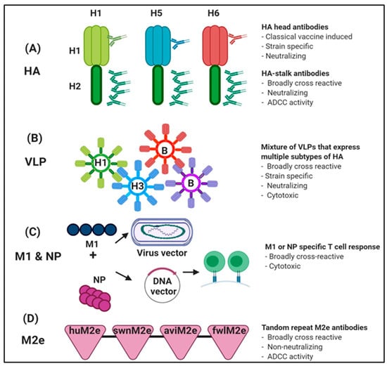 Universal IAV vaccination approaches. (A) Chimeric hemagglutinins (cHAs) consist of the exotic globular head domains and the conserved H2 stalk domain. (B) Mixture of virus like particles (VLPs) that express multiple subtypes of HA (C) Combination approaches with Matrix protein 1 (M1) and nucleoprotein (NP) with virus vectors or DNA vectors. (D) Vaccination strategies based on conserved M2 ectodomain (M2e).