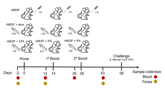 Immunization strategy and sample collection. Days of vaccine administration, adjuvants and routes are shown. The challenge assay was developed 30 days after the last immunization. Blood and feces collection are represented in red and golden brown circles, respectively. For more details of control groups read the text. rMESF, recombinant multiepitope S. flexneri protein. CFA, complete Freund’s adjuvant. IFA, incomplete Freund´s adjuvant. Alum, ImjectTM alum adjuvant. i.n., intranasal. i.m., intramuscular. s.c., subcutaneous.