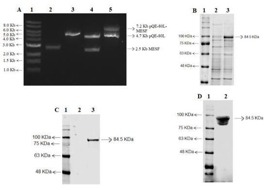 Cloning of chimeric gene (MESF), expression and purification of the recombinant multiepitope protein (rMESF). (A) Cloning of the MESF gene in pQE-80L expression vector with T4 ligase. Lane 1: 1 kb DNA ladder. Line 2: MESF gene. Line 3: pQE-80L. Line 4: product digestions of pQE-80L-rMESF with SmaI and KpnI after ligation. Line 5: full circular size of pQE-80L-rMESP (B). SDS–PAGE of the expressed rMESF in E. coli BL21 cells after the induction with 1 mM IPTG for 4 h at 37 °C. Line 1: molecular mass marker. Line 2: protein before induction with IPTG. Line 3: proteins after induction with IPTG showing the rMESF protein with 84.5 kDa. (C) Western blot confirming the expression of rMESF after the induction with IPTG. (D) Western blot confirming the presence of rMESF protein after the purification-elution by Ni-NTA affinity chromatography. IPTG, isopropylthiogalactoside; SDS–PAGE, sodium dodecyl sulfate–polyacrylamide gel electrophoresis.