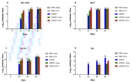 Antibody serum titers in controls and immunized mice. (A) Serum IgG. (B) IgG1. (C) IgG2a. (D) serum IgA. Controls, PBS+alum and PBS+CFA. rMESF+alum groups were immunized intramuscular (i.m.). rMESF +CFA were immunized through intradermic route (i.d.) and the first and second boosters were applied in this group through subcutaneous (s.c.) and i.m. routes, respectively with incomplete Freund’s adjuvant (IFA). rMESF groups were immunized with rMESF alone trough intranasal route (i.n.). The two booster doses were given to all experimental mice groups on the 14th and 28th days. Antibody titers were expressed as mean ± standard deviation (SD) of log10 of the last reciprocal serum dilution above cut-off. Symbols and letters indicate statistically significant values of p < 0.0001 compared with the respective mice group, # vs. PBS+CFA, a vs. PBS+alum. b vs. rMESF +alum, c vs. rMESF +CFA. PBS, phosphate-buffered saline. CFA, complete Freund’s adjuvant.