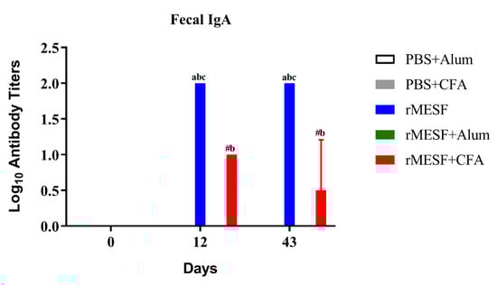 Antibody titers of fecal IgA in controls and immunized mice. Controls, PBS+alum and PBS+CFA. rMESF+alum groups were immunized intramuscular (i.m.). rMESF+CFA were immunized through intradermic route (i.d.) and the first and the second boosters were applied in this group through subcutaneous (s.c.) and i.m. routes, respectively with incomplete Freund’s adjuvant (IFA). rMESF groups were immunized with rMESF alone trough intranasal route (i.n.). The two booster doses were given to all experimental mice groups on the 14th and 28th days. Antibody titers were expressed as mean ± standard deviation (SD) of log10 of the last inverse serum dilution above cut-off. rMESF+alum group remains below the cut-off value calculated, Symbols and letters indicate statistically significant values of p < 0.0001 as compared with the respective mice group, # vs. PBS+CFA, a vs. PBS+alum, b vs. rMESF +alum, c vs. rMESF +CFA. PBS, phosphate-buffered saline. CFA, complete Freund’s adjuvant.