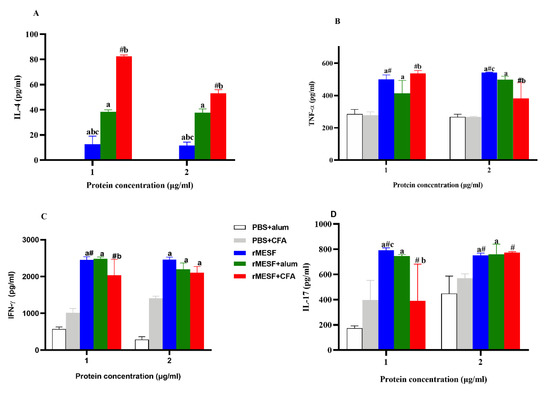 Cytokine levels quantified by ELISA sandwich. Production of (A) IL-4, (B) TNF-α, (C) IL-17 and (D) IFN-γ, present in the supernatant of splenocytes stimulated in vitro with 1 or 2 μg/mL of rMESF multiepitope fusion proteins for 72 h. Splenocytes were collected after 30 days of the last immunization (n = 5 mice/group). The absorbance was measured at 450 nm. Symbols and letters indicate statistically significant values with p values raging from <0.05 to 0.0001 (for more details read the text) as compared with the respective mice group. # vs. PBS+CFA, a vs. PBS+alum, b vs. rMESF+alum, c vs. rMESF+CFA. PBS, phosphate-buffered saline. CFA, complete Freund’s adjuvant. Results are plotted as mean ± standard deviation.