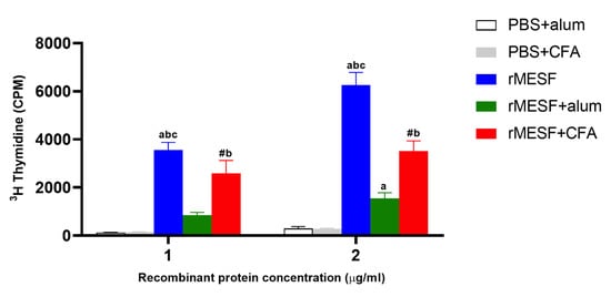 Lymphocyte proliferation. Splenocytes were collected from mice groups (n = 5 mice/group) after 30 days of the last immunization and stimulated in vitro with 1 μg/mL or 2 μg/mL with rMESF multiepitope fusion protein. Symbols and letters indicate statistically significant values of p < 0.0001 compared with the respective mice group. # vs. PBS+CFA, a vs. PBS+alum, b vs. rMESF + alum, c vs. rMESF + CFA. PBS, phosphate-buffered saline. CFA, complete Freund’s adjuvant. Results are plotted as mean ± standard deviation.