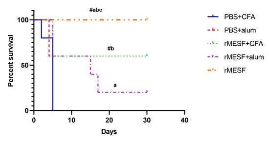 Protective efficacy of rMESF multiepitope fusion protein immunization on survival. Groups of female BALB/c mice (n = 5 mice/group) were immunized through different routes and adjuvant with 25 µg/mouse of rMESF. Thirty days after the last booster, mice were challenged with a S. flexneri lethal dose of 1 × 107 CFU/mouse i.n. Mortality was observed for 30 days. Symbols and letters indicate statistically significant values of p < 0.0001 compared with the respective mice group. # vs. PBS+CFA, a vs. PBS+alum b vs. rMESF + alum, c vs. rMESF + CFA. PBS, phosphate-buffered saline. CFA, complete Freund’s adjuvant. i.n., intranasally. The protective effect was represented as Kaplan-Meier survival curves.