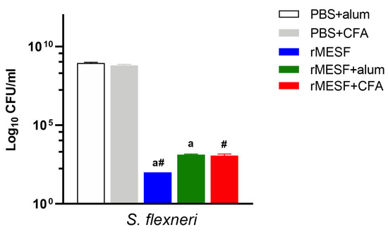 Bacterial burden in lungs after challenge assay of control and immunized mice. Lungs were collected from survival mice and controls groups after 30 days and three days, respectively, of challenge with lethal dose of S. flexneri (1 × 107 CFU/mouse), and bacterial loads were determined by 10-fold serial dilutions on LB agar plates incubated at 37 °C for 18 h. Symbols and Letters indicate statistically significant values of p < 0.0001 compared with the respective mice group. # vs. PBS+CFA, a vs. PBS+alum. PBS, phosphate-buffered saline. CFA, complete Freund’s adjuvant. CFU, colony forming units; i.n., intranasally.