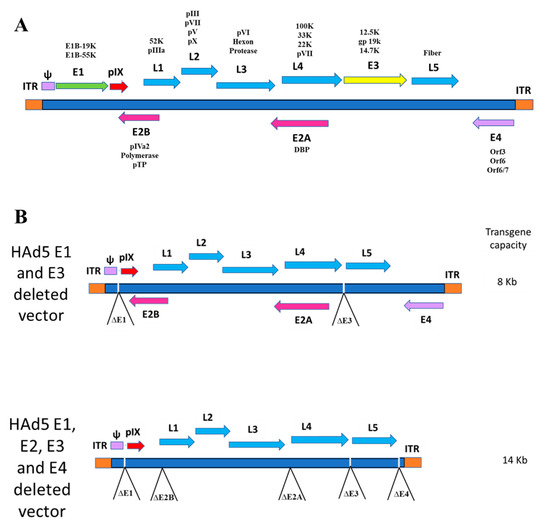 Adenoviruses (Ads) belong to the family Adenoviridae. They are widely prevalent in humans, other mammals, birds, reptiles, amphibians, and fish. Out of more than 100 human Ad types, several are involved in mild respiratory infections, gastroenteritis, or conjunctivitis [1,2,3]. They are nonenveloped icosahedral viruses of approximately 90 nm in diameter with a core comprising a double-stranded linear DNA genome of roughly 25–48 kilobase pairs (kbp). The Ad genome has inverted terminal repeats (ITRs) on the right and left ends. The ITRs vary in length from 30 to 371 bp. These ITRs are essential in the initiation of the Ad genome replication. A genome packaging signal (Ψ) is found next to the left ITR, which is necessary for Ad genome packaging (Figure 1). The Ad genome encodes early genes (E1A, E1B, E2–E4) and late genes (L1–L5). The early genes are essential for the modulation of the host cell genes and the initiation of the Ad genome replication. The Ad late genes are encoding the majority of structural proteins required for the Ad capsid assembly [4].