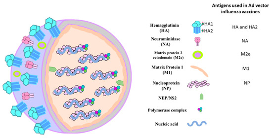 The success of the currently available seasonal influenza vaccines is mainly dependent on the match between the vaccine strains and the circulating influenza viruses during the influenza season. A significant antigenic mismatch could result in a variable degree of vaccine failure and higher incidence of influenza-like illnesses [16,17,18]. The use of GSK’s AS03 [15,19], Sanofi Pasteur’s AF03 [20], MF59 of Novartis [14,15], or Vaxine’s Advax-CpG55.2 adjuvant [21] may, on the other hand, broaden the coverage of the current influenza vaccines. The diagrammatic representation of influenza virus structural components, including the immunogenic antigens that could be used for developing Ad vector-based influenza vaccines, is shown in Figure 2.