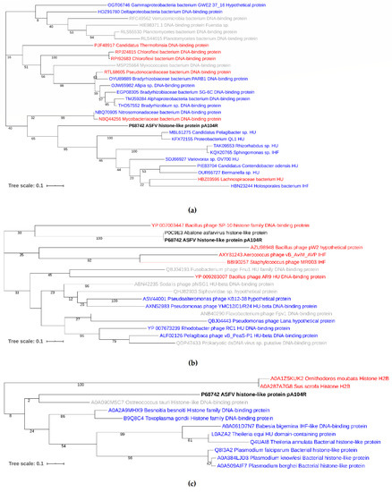 - Borca, M.V.; Irusta, P.M.; Kutish, G.F.; Carrillo, C.; Afonso, C.L.; Burrage, T.; Neilan, J.G.; Rock, D.L. A structural DNA binding protein of African swine fever virus with similarity to bacterial histone-like proteins. Arch. Virol. 1996, 141, 301–313. [Google Scholar] [CrossRef]