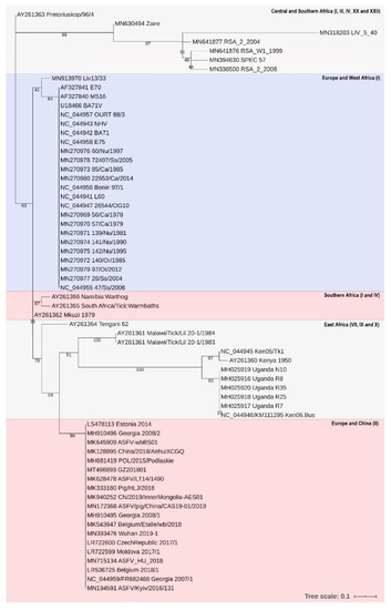 - Michaud, V.; Randriamparany, T.; Albina, E. Comprehensive Phylogenetic Reconstructions of African Swine Fever Virus: Proposal for a New Classification and Molecular Dating of the Virus. PLoS ONE 2013, 8, e69662. [Google Scholar] [CrossRef] [PubMed]