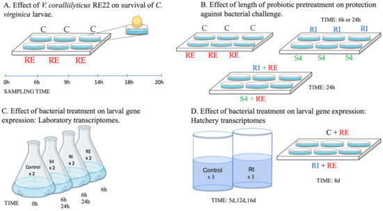 Schematic showing experimental design for the larval survival and transcriptomic experiments performed. Labels (A–D) represent individual experimental designs. Treatments include probionts Phaeobacter inhibens S4 and Bacillus pumilus RI0-695, denoted as S4 and RI, respectively, pathogen V. coralliilyticus RE22, denoted as RE, and control denoted as C.